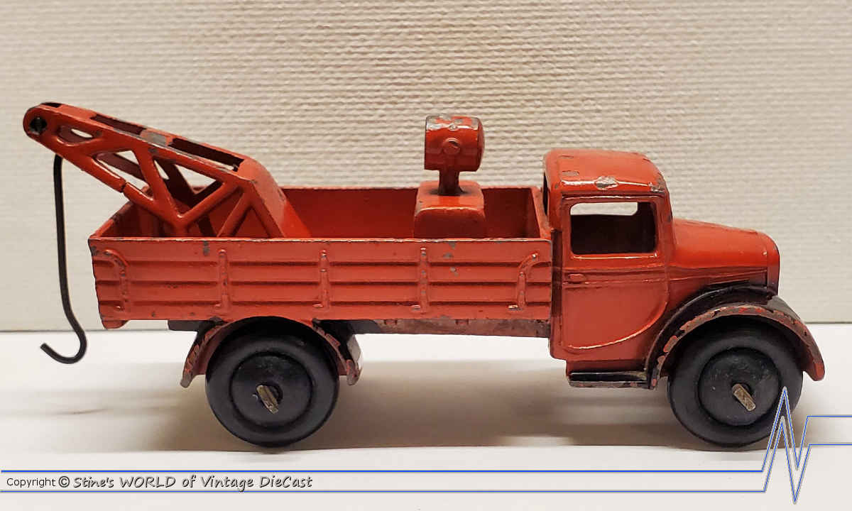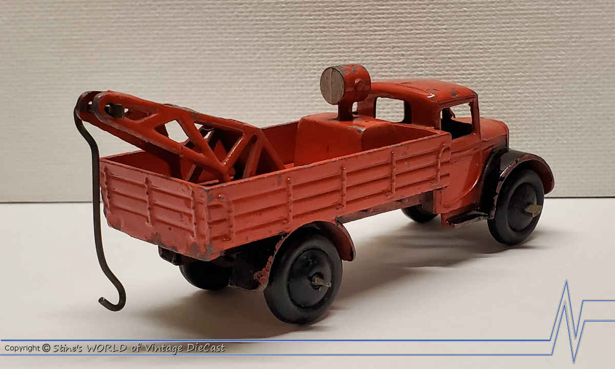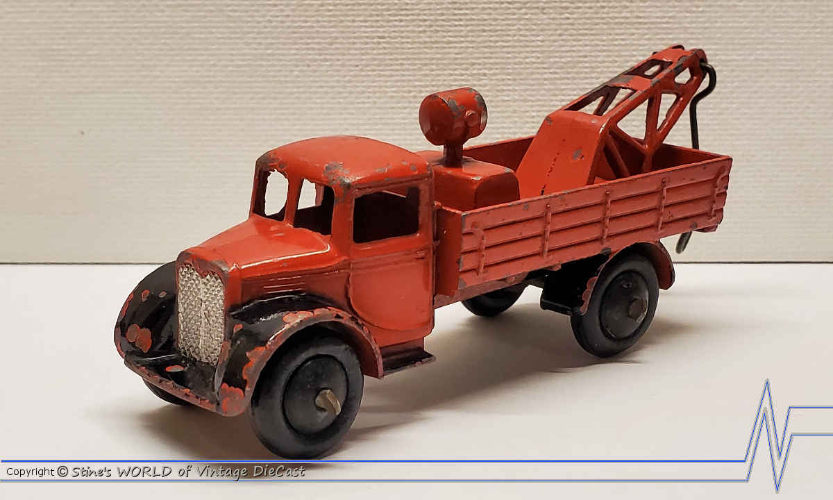 The Breakdown Crane Lorry was introduced as early as 1935 in various body colours including green, yellow, red and grey with smooth black hubs. Later versions starting in the mid-1940s, replaced the smooth hubs with black ridged hubs.