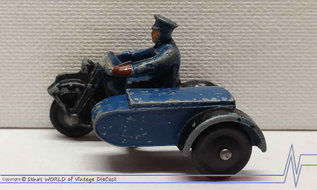 The #43b RAC Motorcycle Patrol was introduced in 1935. The motorcycle was black and blue with a blue drivers and white rubber tires. Later versions had black rubber tires.