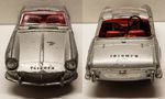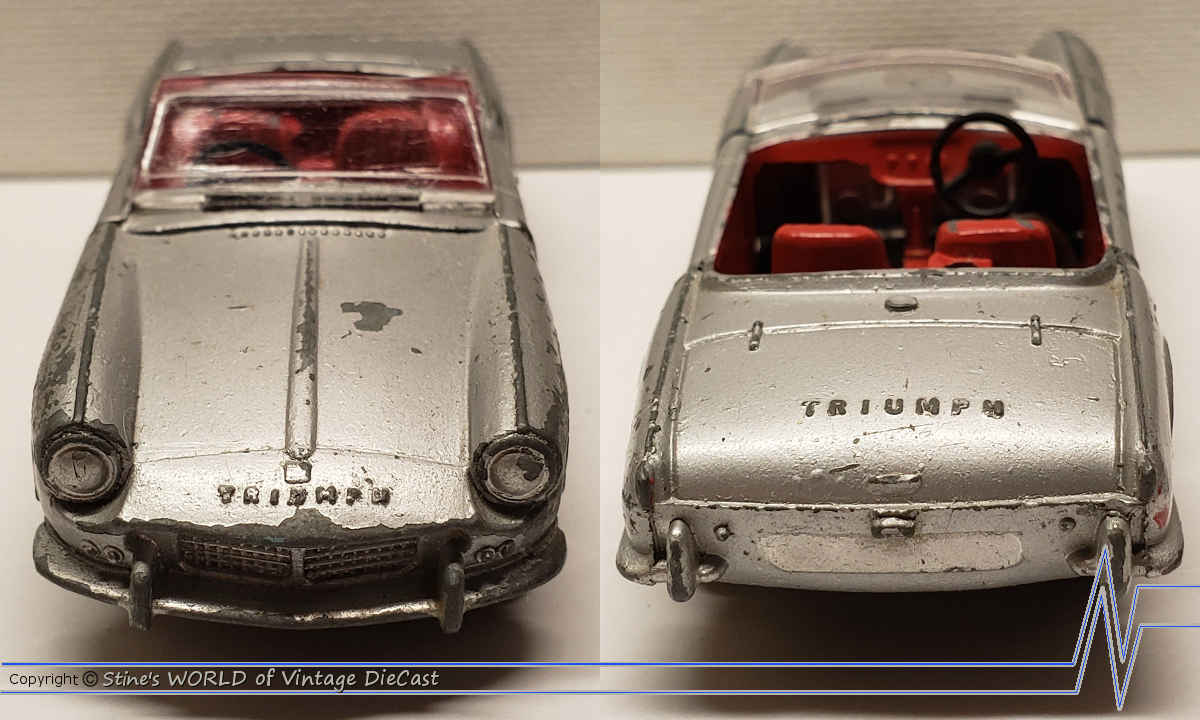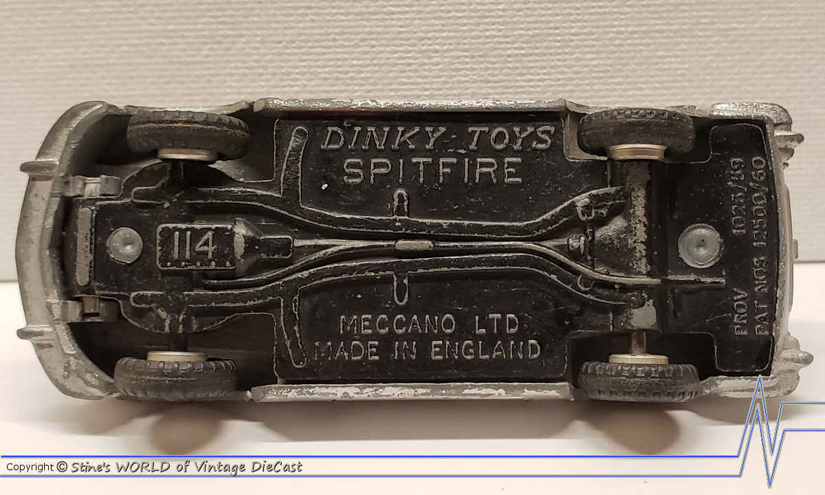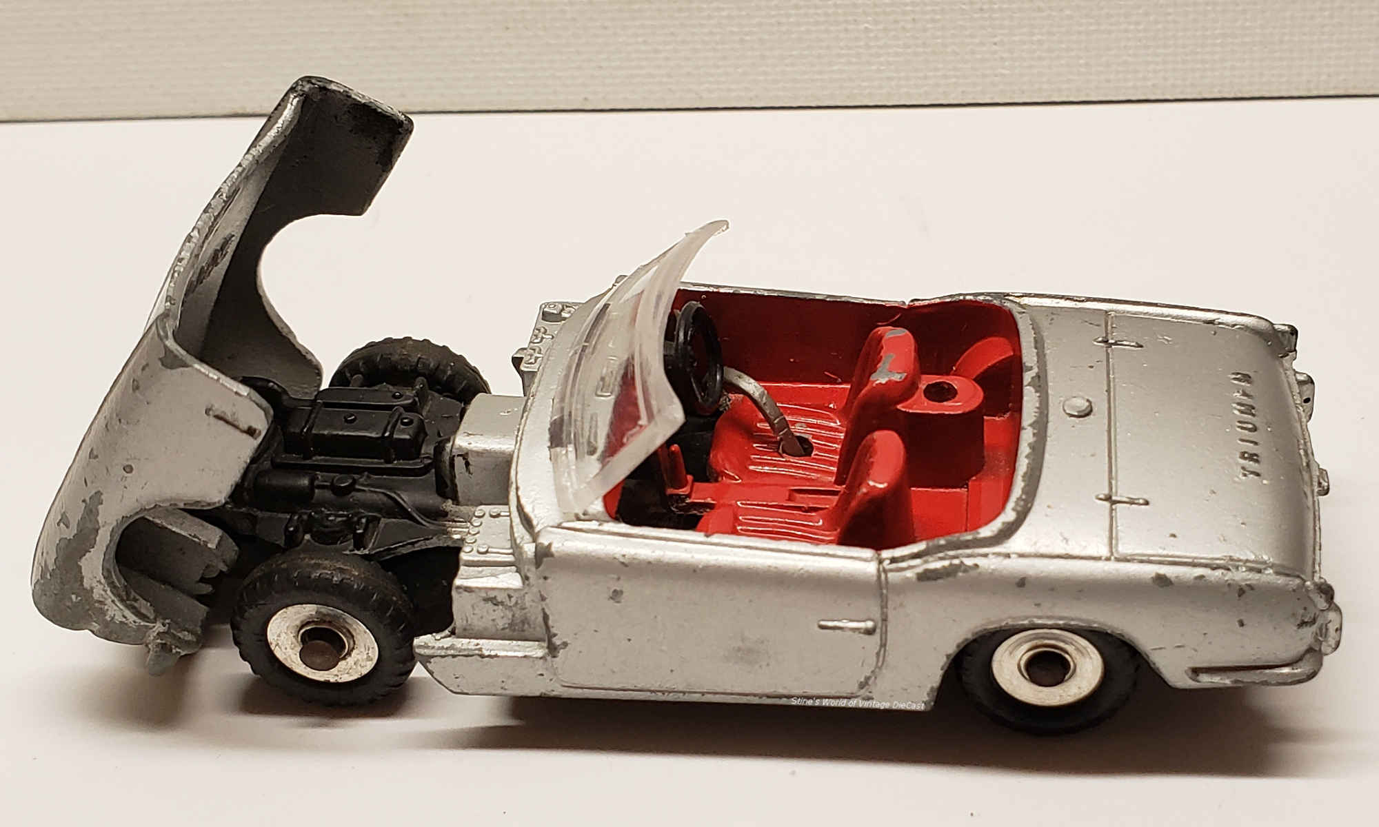 The Triumph Spitfire was introduced in 1963. The most popular body colours for the Dinky # 114 was silver or gold with red and purple being more difficult to find. This model came with a removable driver that was secured with a seatbelt and spun hubs. The plastic windshield was often broken with rough play.