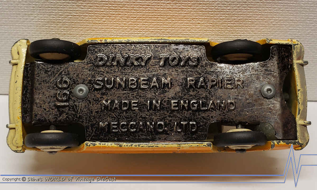 The Sunbeam Rapier Saloon was introduced in 1958 in a two-tone colour scheme. Two versions were produced – cream with orange side panels and light blue with dark blue side panels. All versions included windows and early models used ridged hubs that were replaced with spun hubs in later versions.