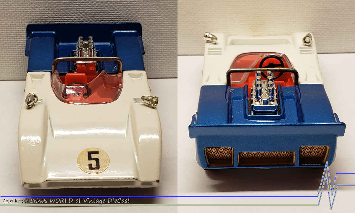 The McLaren M8A was introduced in 1970 in either a white/blue body colour or solid green. Earlier versions used cast wheels and then replaced with plastic speedwheels. The rear hood could lift revealing the engine.
