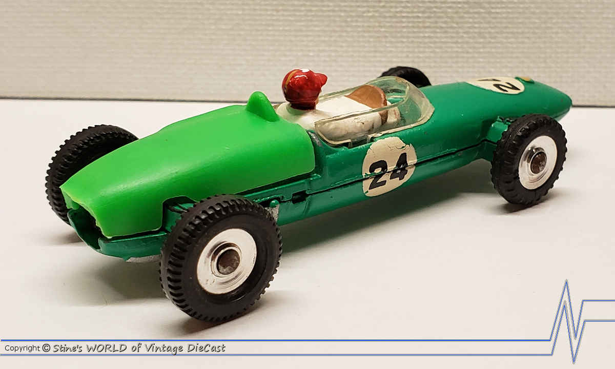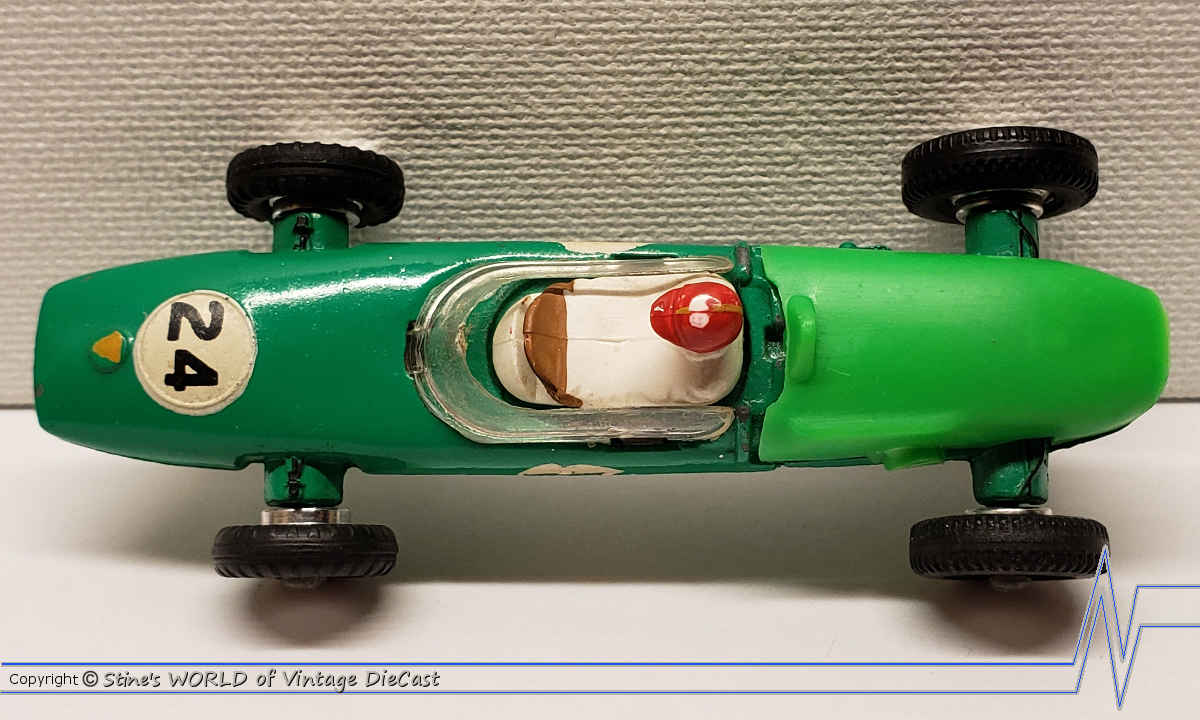 The Lotus Racing Car as introduced in 1963 as part of the new racing series that included the Dinky #240 Cooper, #241 Lotus, #242 Ferrari and the #243 BRM. The Lotus was only available in a green body colour with the number 24 or 7 racing decals and spun hubs.