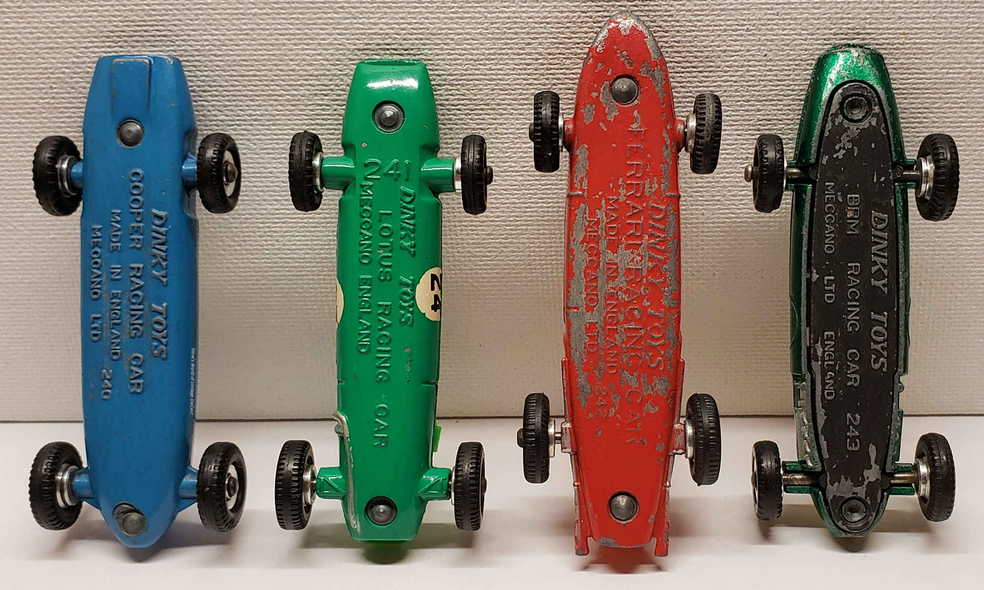 Baseplate Comparison (from left to right) #240 Cooper, #241 Lotus, #242 Ferrari and the #243 BRM