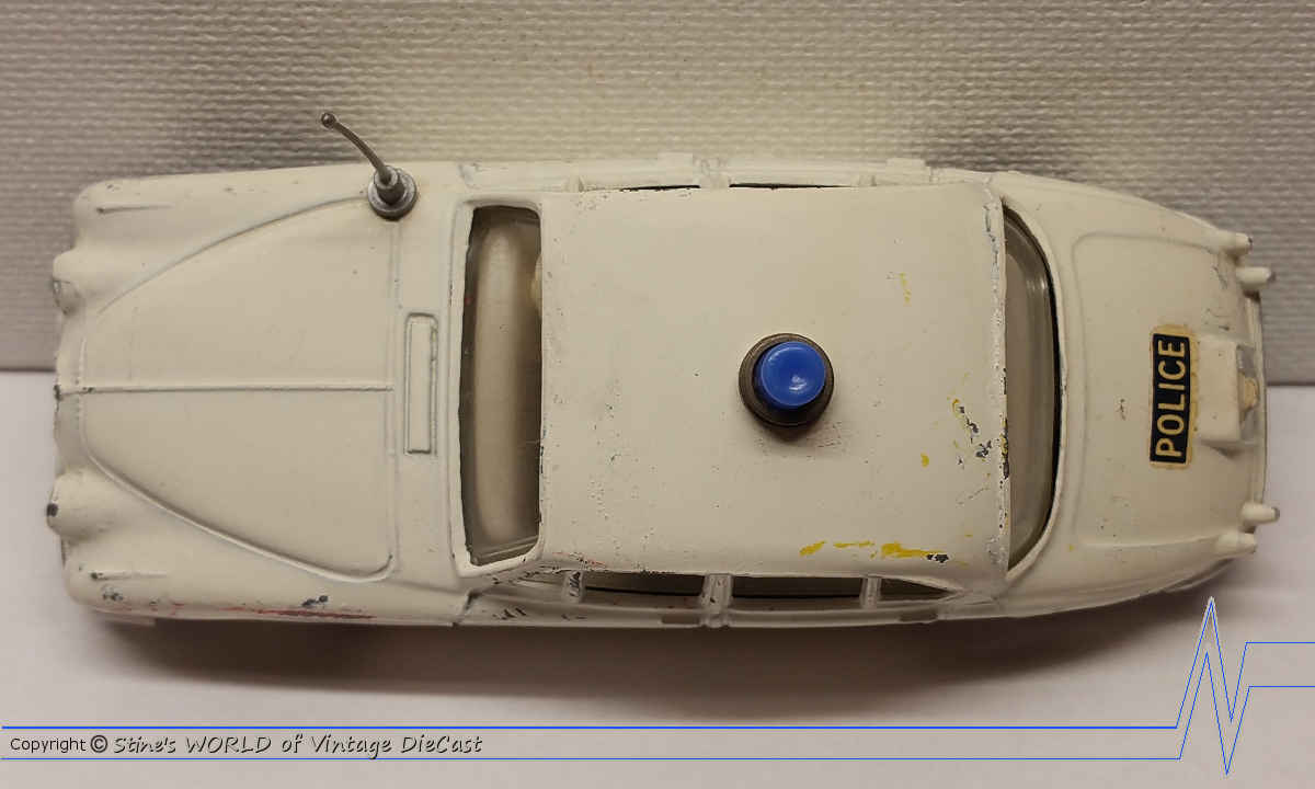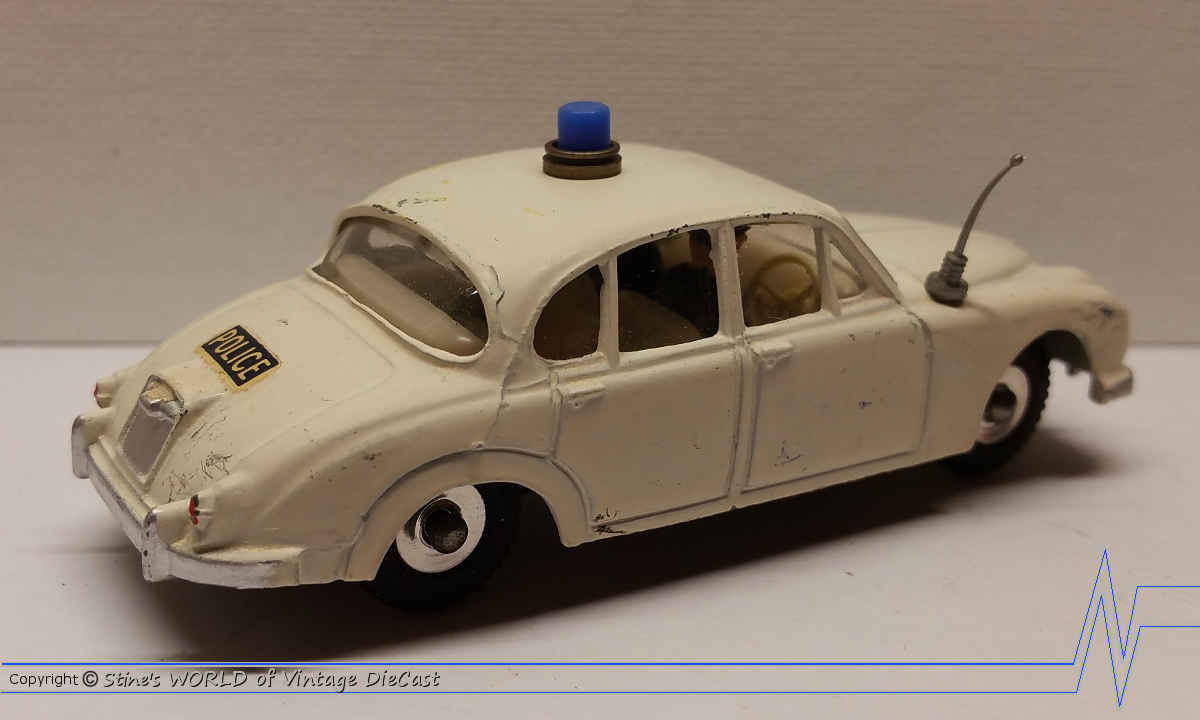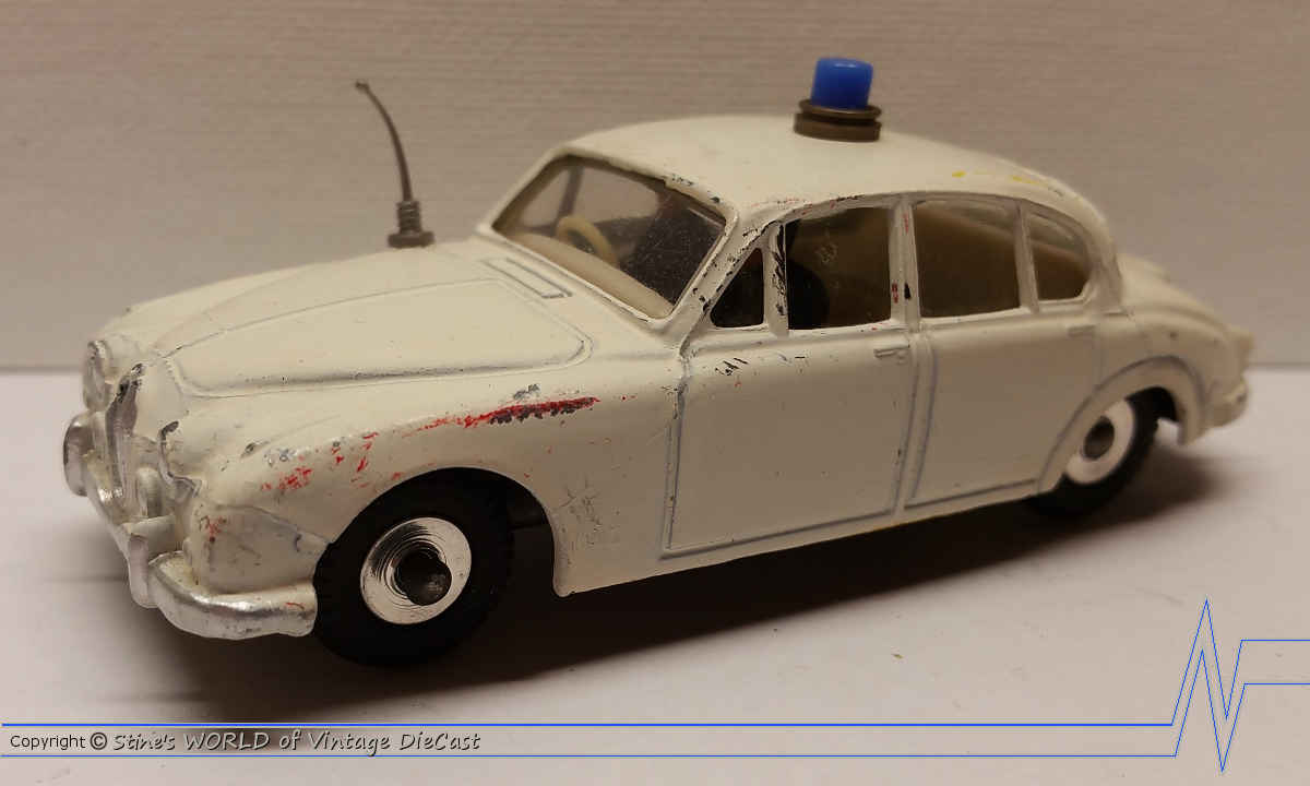 The Jaguar Motorway Police Car was introduced in 1962 as a police car. The model came in a white body with blue siren, plastic antenna and spun hubs.