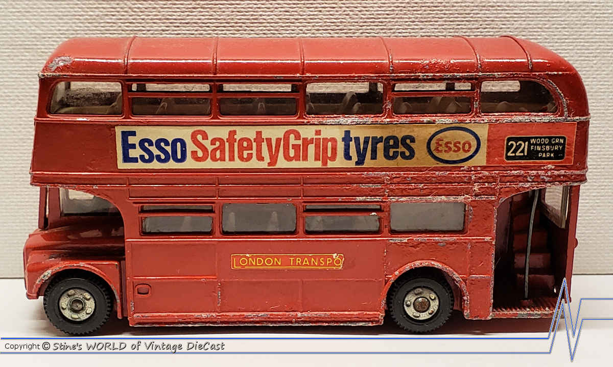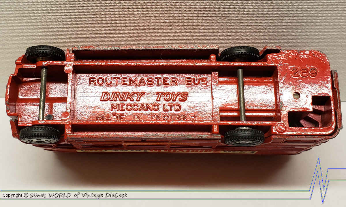 The Routemaster Bus is one of the most common Dinky models ever sold. The #289 was introduced in 1964 and was available with many different advertisement logos on the side of the bus. Early versions used spun hubs and later replaced with plastic wheels.