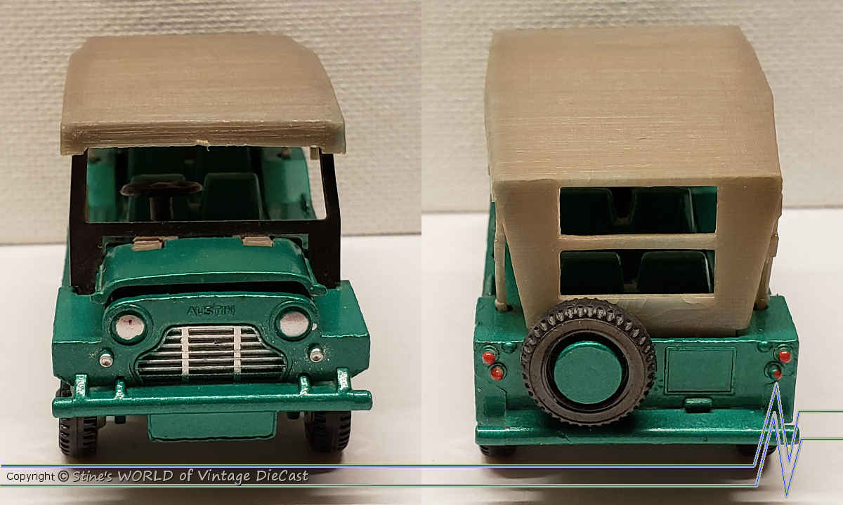 The Austin Mini Moke was introduced in 1967 and was available in a metallic green body colour with a light brown canopy. Early versions used spun hub and later replaced with speedwheels. This was not the first model #342 that Dinky used in their manufacturing identification. The original Dinky #342 model was the farm Motocart in 1954.