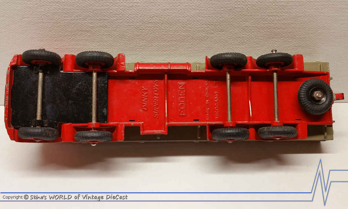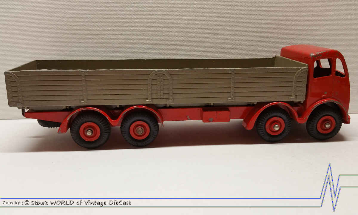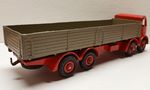 The Foden Diesel 8-Wheeled Wagon was introduced in 1947 and subsequently renumbered to 901 in 1954. This model was available in various colour combinations including red, blue, orange, black, yellow and grey between the cab and the chassis. There were two types of grilles used on the cab -- early versions used a rectangular flat grille, while later version were more detailed with lines and openings .