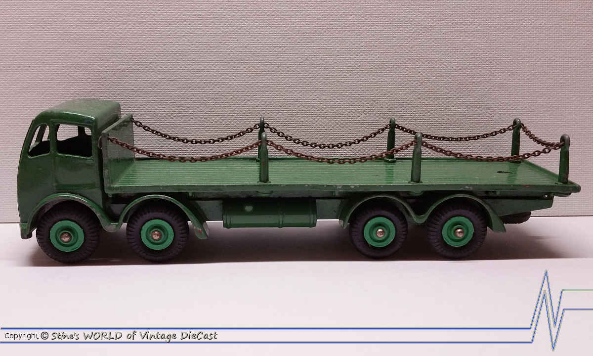 The Foden Flat Truck was introduced in 1952 and subsequently renumbered to 905 in 1954. This model came in a green and red with later versions in blue and two-tone. There were two types of grilles used on the cab. The chain added realism to the model and usually broke and was lost. Commonly, one or two posts on the flat bed were missing as they often broke-off with rough play.