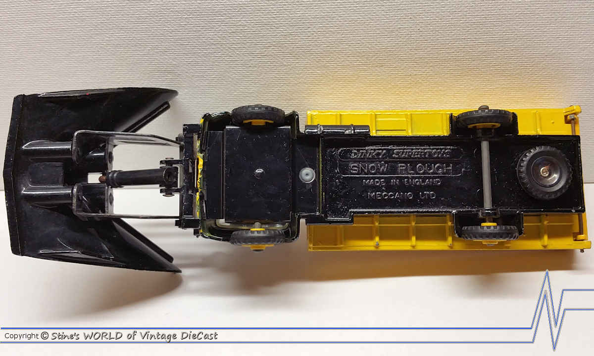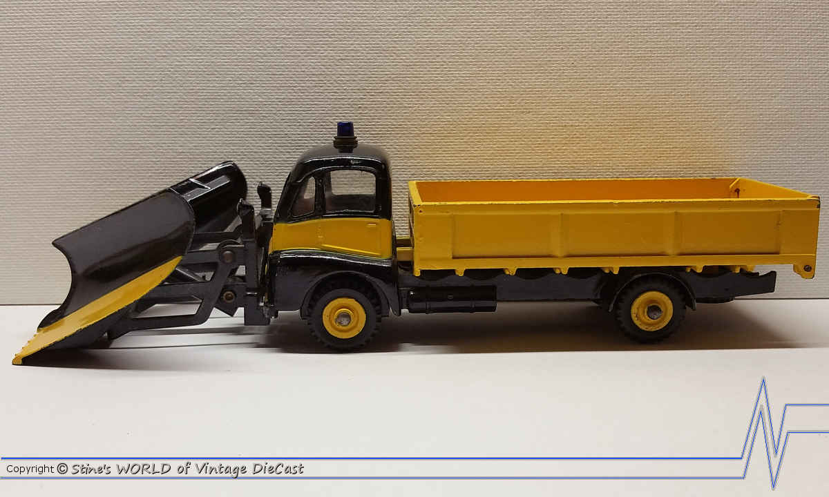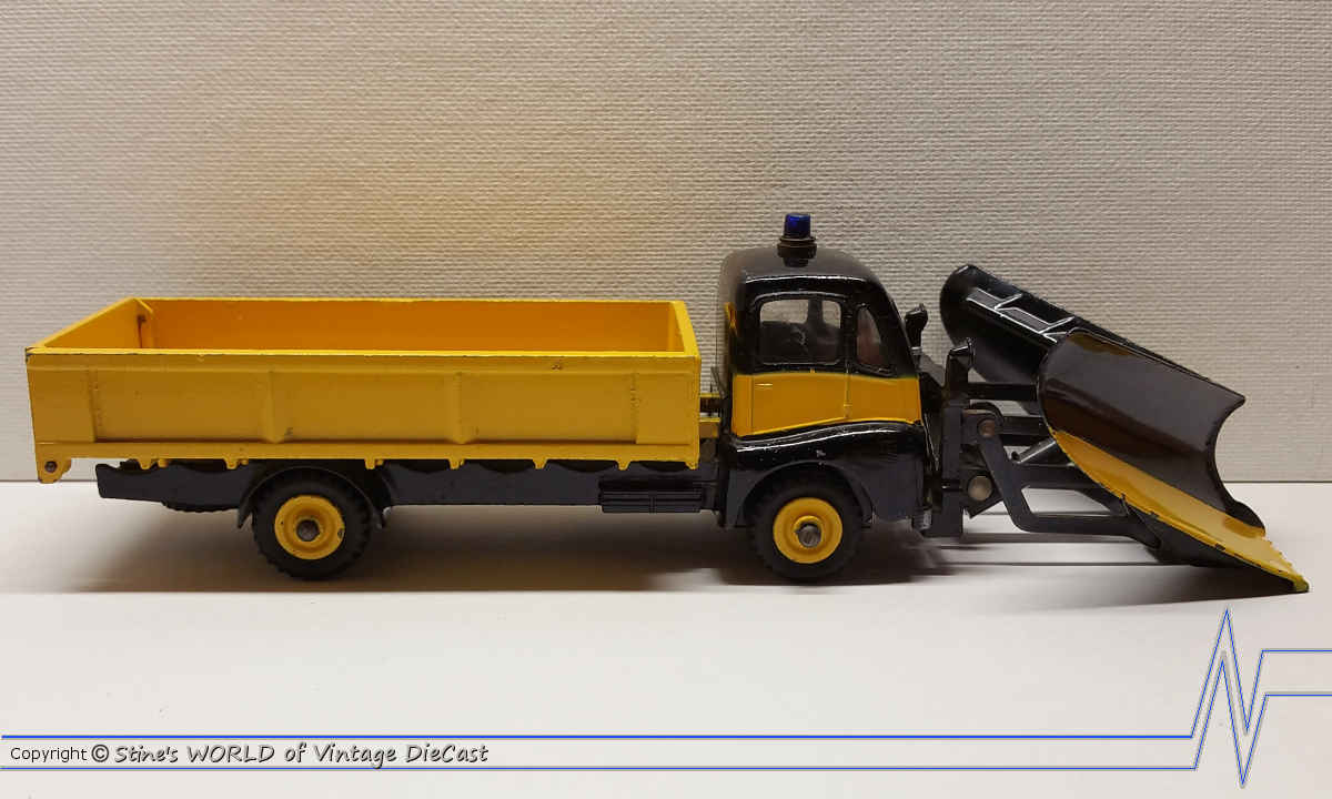 The Dinky #958 Snow Plough was issued in 1961 in a two-tone black and yellow body. This was a fairly large model with moving parts. The plough could move up and down through a simulated hydraulic arm and the tailgate opened and closed. Some versions on this model used a silver colour plough instead of the tow-tone black and yellow.
