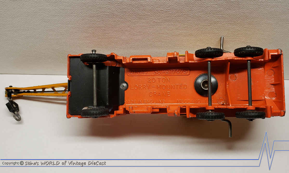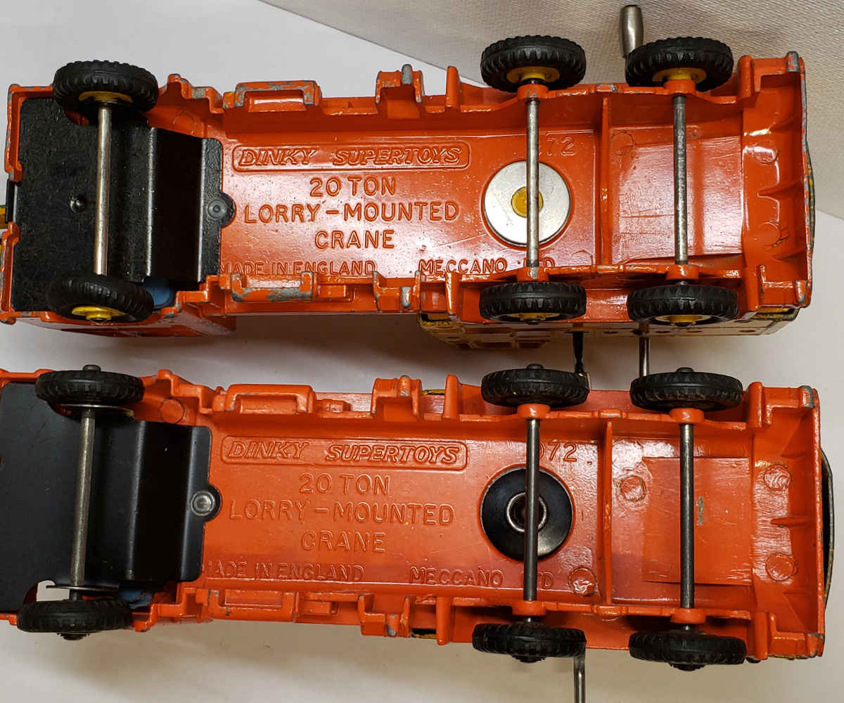 The Coles 20-Ton Lorry was introduced in 1955 and was available in an orange and yellow body. The Dinky #972 had moving parts with two built-in cranks that controlled the JIB arm and hook. Early models used yellow hubs with grey or black tires and newer versions installed black hubs.