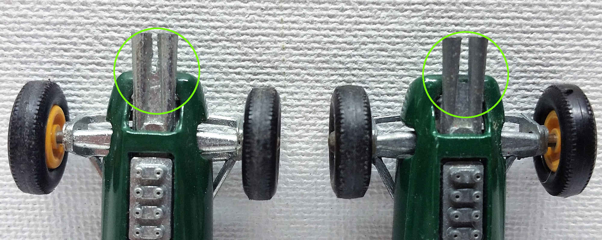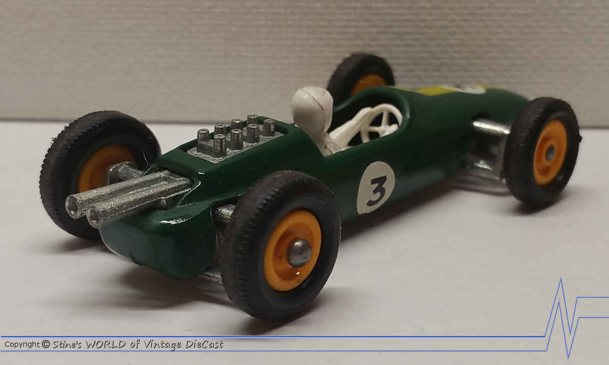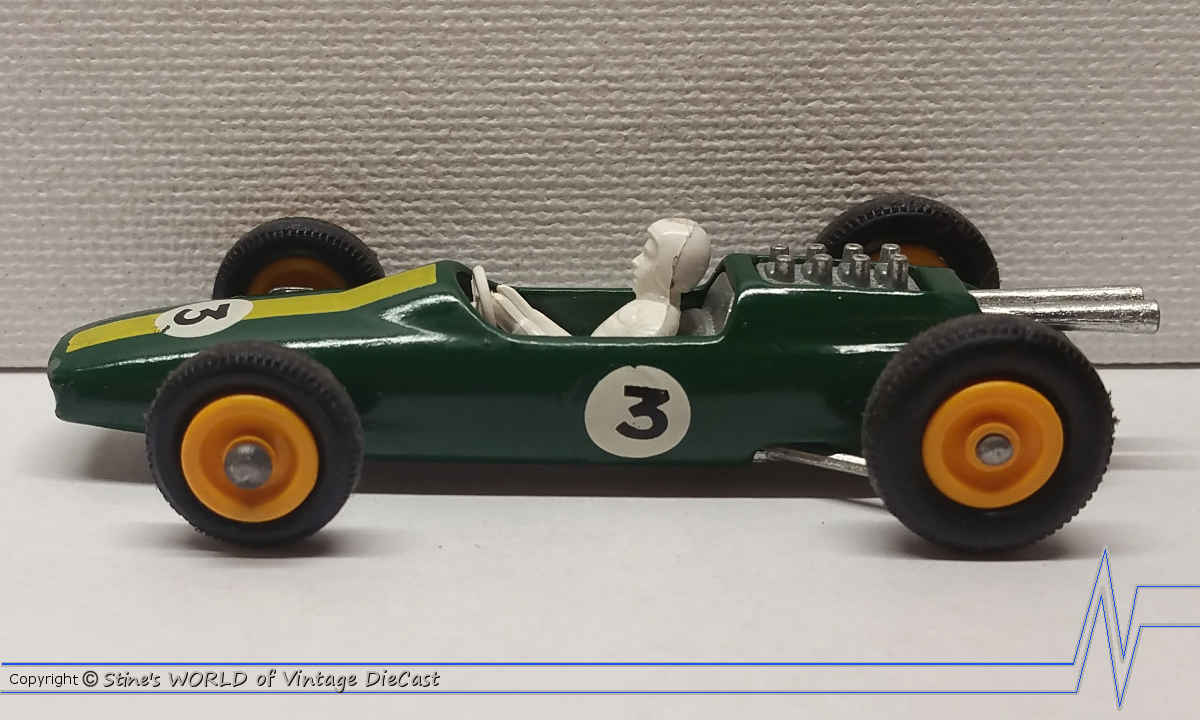 Moko Lesney Matchbox #19d Lotus Racing Car (1965) - Green Body with Small Text & Longer Support Exhaust