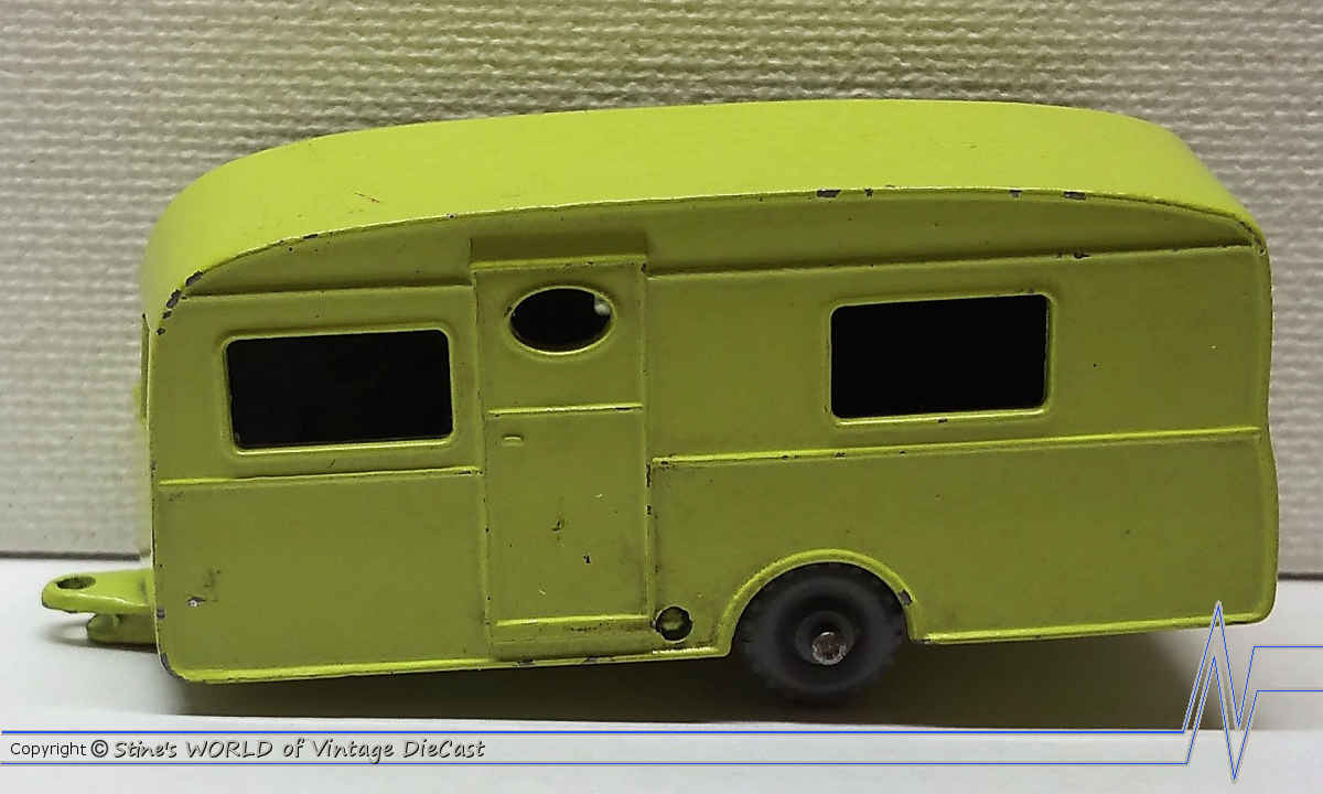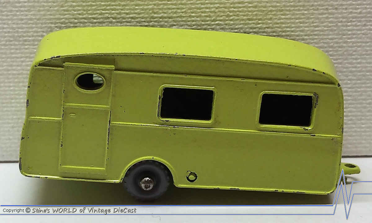 Moko Lesney Matchbox #23b Berkeley Cavalier Caravan (1958) - Lime Green with Grey Plastic Wheels & Flat Surface Tow Hitch