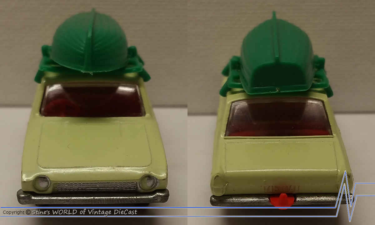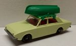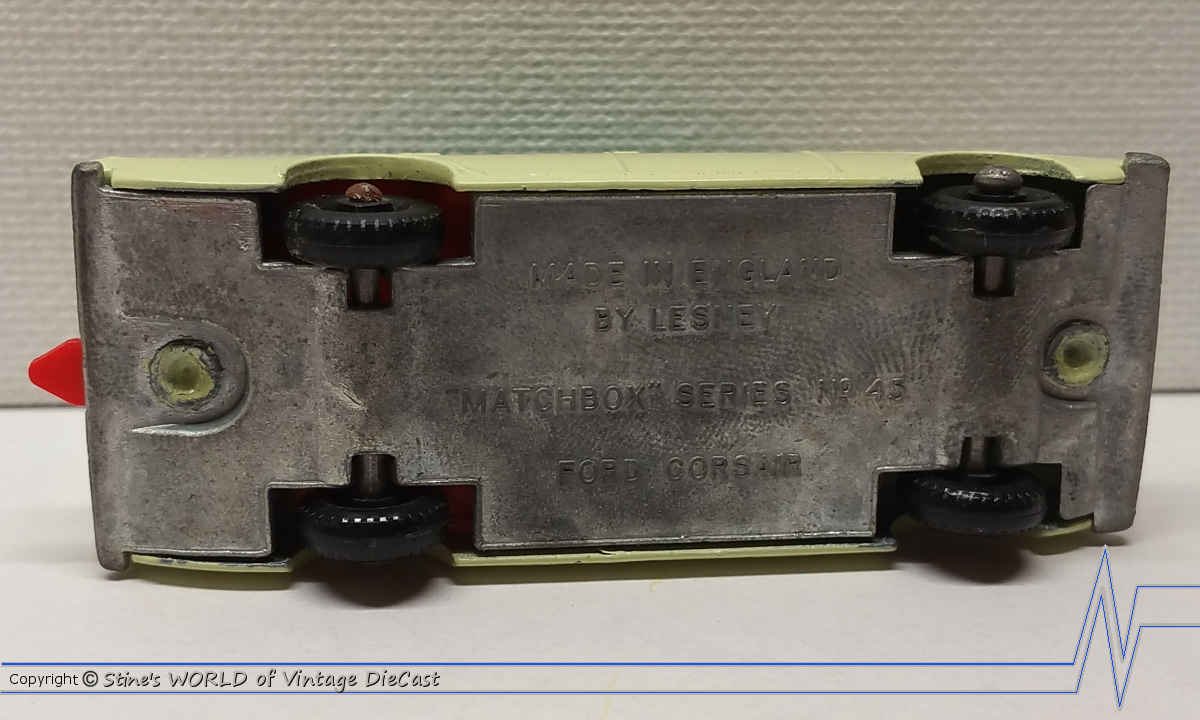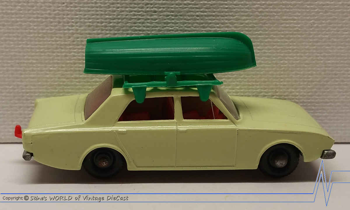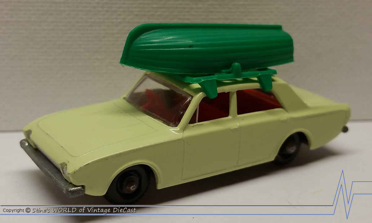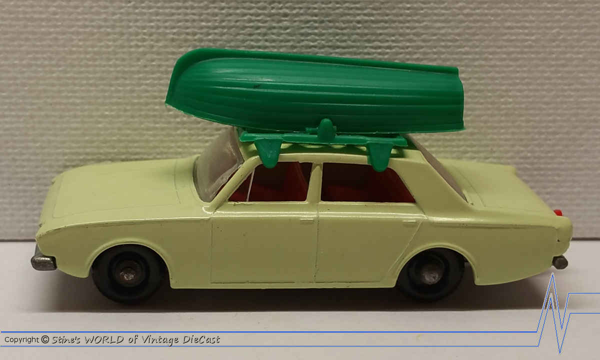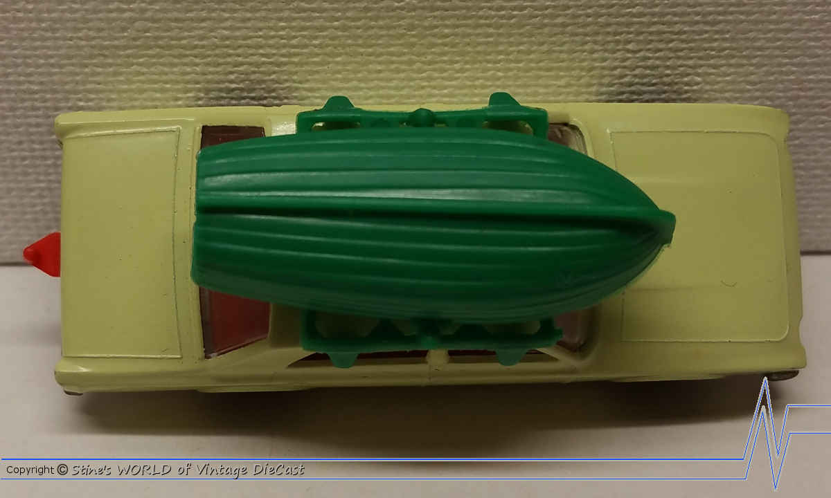 Moko Lesney Matchbox #45b Ford Corsair with Roof Rack & Boat (1965) - Pale Yellow with Red Interior, Black Wheels & Unpainted Baseplate