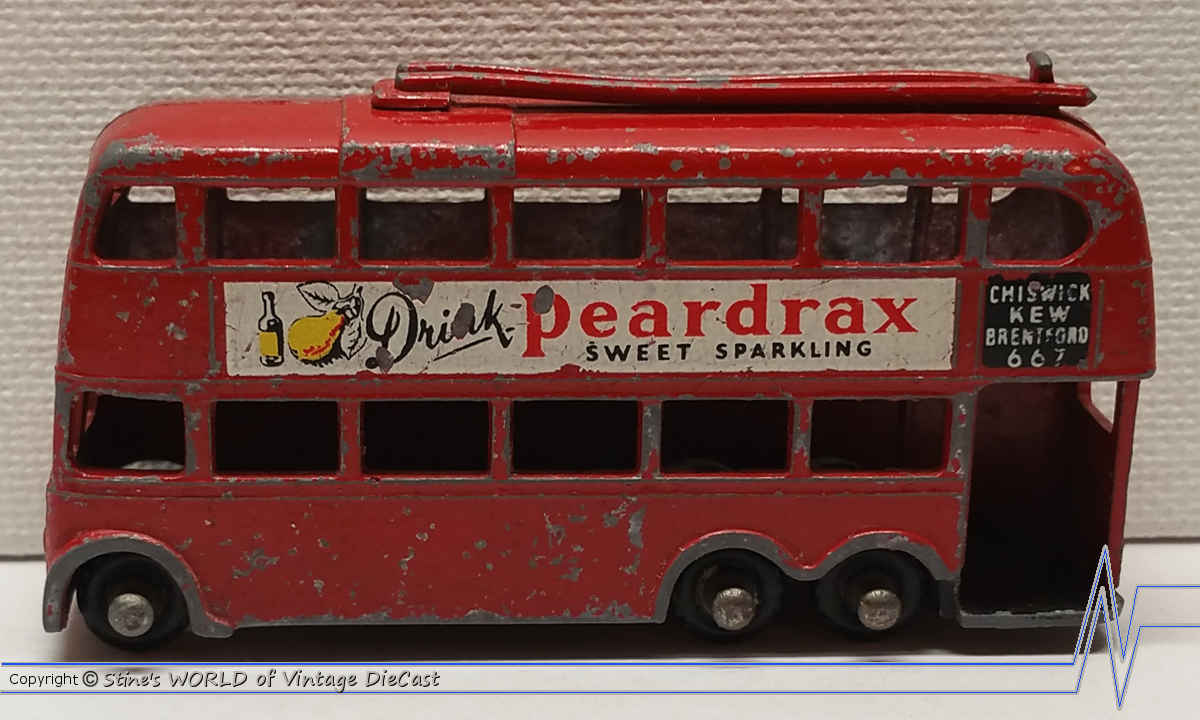 Moko Lesney Matchbox #56a London Trolley Bus (1958) - Drink "Peardrax" with Black Wheels