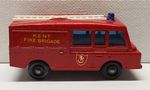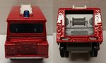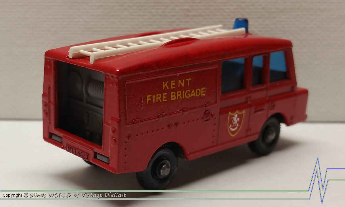 Moko Lesney Matchbox #57c Land Rover Fire Truck (1966) -Red Body with Decals, Black Plastic Wheels & Axle Support Braces